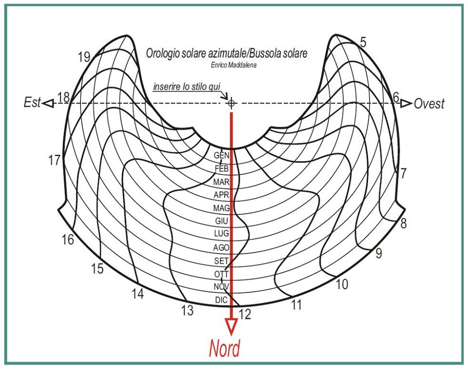Esiste una differenza fra l’ora solare (quella marcata dal moto apparente del Sole sulla sfera celeste) e l’ora media che segna l’orologio da polso, in dipendenza della diversa velocità di rivoluzione della Terra intorno al Sole (2° legge di Keplero). Di tale differenza, variabile nel corso dell’anno fino ad un massimo di sedici minuti e che costituisce la cosiddetta “equazione del tempo”, ho tenuto conto nel calcolo e nel disegno della bussola solare, per cui non ci interessa più di tanto.
